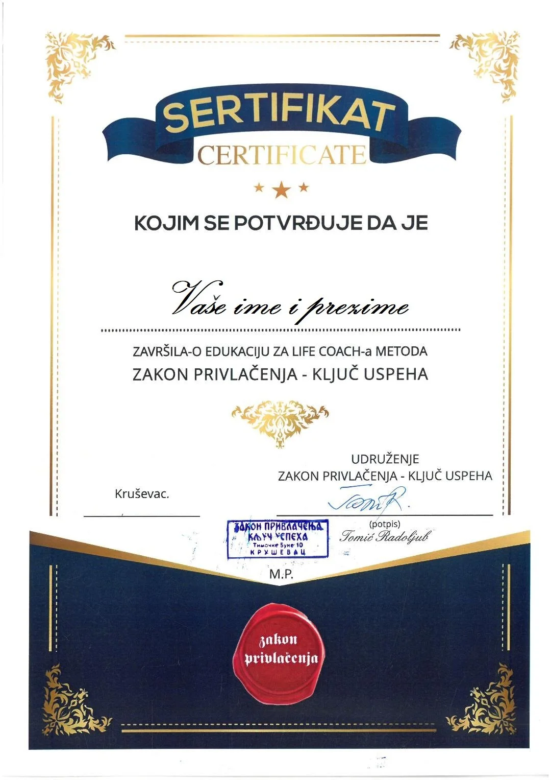Obuka traje 4 meseca i tada posle komisijske provere praktičnog i teoretskog znanja, udruženje „Zakon Privlačenja - Ključ uspeha“ izdaje sertifikat za life coach-a za metod „Zakon Privlačenja - Ključ uspeha.